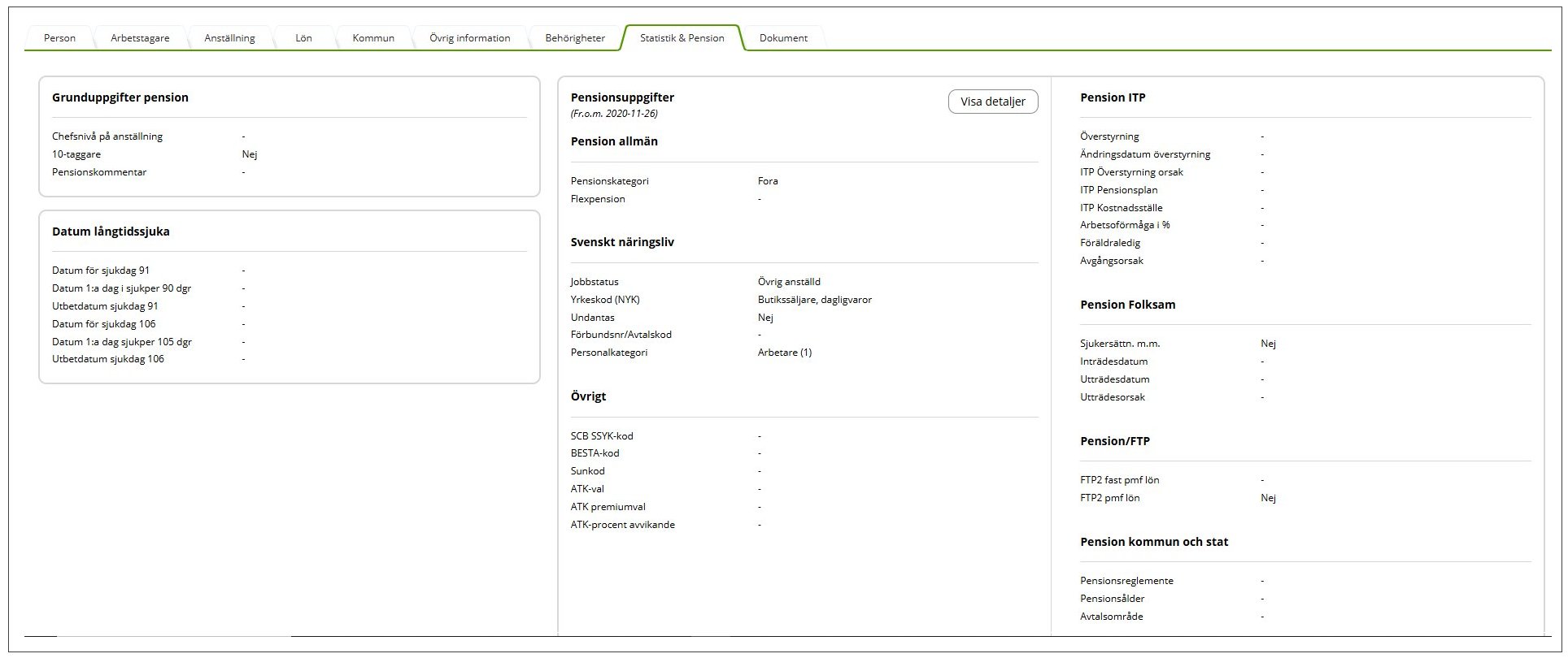 Under Pensionsuppgifter finns information om personens uppgifter om tillhörande pensionskategori, vlken yrkeskod den anställde tillhör samt från vilket datum pensionen har börjat gälla.