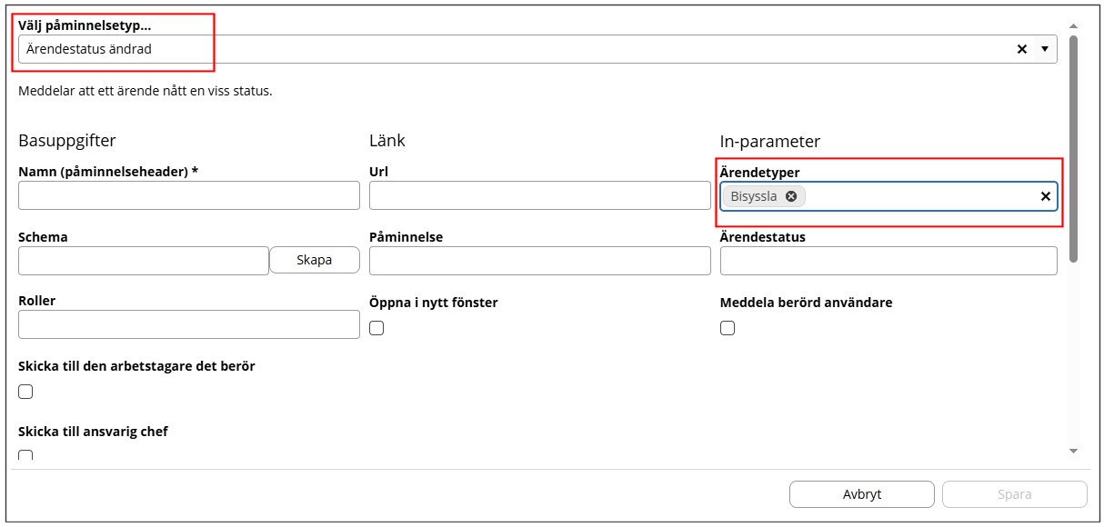 Fyll i nödvändiga basuppgifter samt markera aktuella kryssrutor. Du hittar påminnelsen Ärendestatus ändrad under avsnittet Ärenden i Standardpåminnelser i systemet under sektionen Admin/Inställningar.