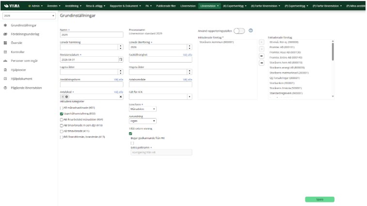 Obligatoriska fält är Namn, Inkluderande företag eller Rapporteringsställe, Löneår återföring, Revisionsdatum, Avtalskod och Välj lönemetod. Alla listrutor (drop down) är multipla. Fältet Avtalskod/Inkludera kategorierer använder du för att selektera fram kategorier.
