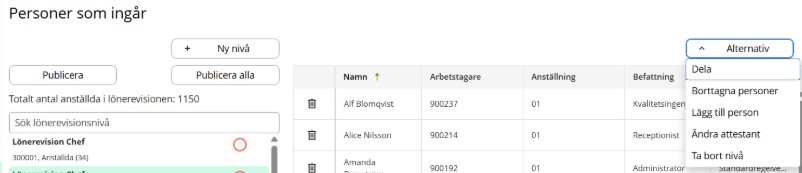Den lägger sig med de övriga nivåerna i listan för lönerevisionsnivåerna. För att lägga till personer använder du knappen Alternativ/Lägg till person.