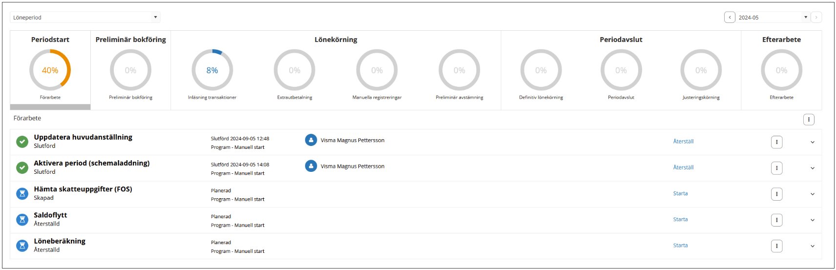 Direkt under fliken Löneprocesser kan du se hur långt varje process har gått. Det visar sig i runda cirklar med 2 olika färger samt % hur mycket av jobbet/körningen som är klart.
