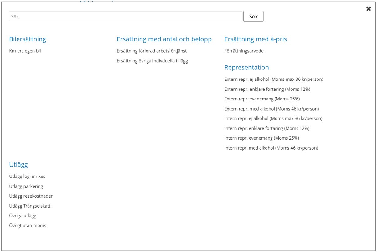 Momsbeloppet beräknas enligt den procentsats som har angetts på momskoden i fältet À-pris i reseförvaltningens à-pristabell. Vill du vill ange en annan momssats på reseräkningen kan den beräknade momssatsen skrivas över, huruvida detta är möjligt styrs dock från reseförvaltningens styrtabell.
