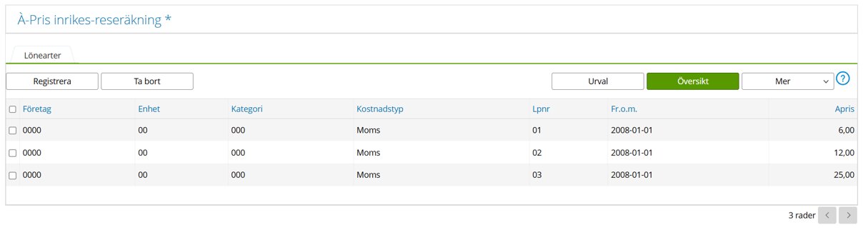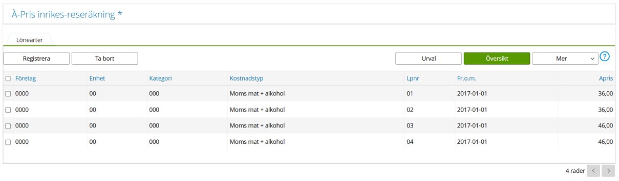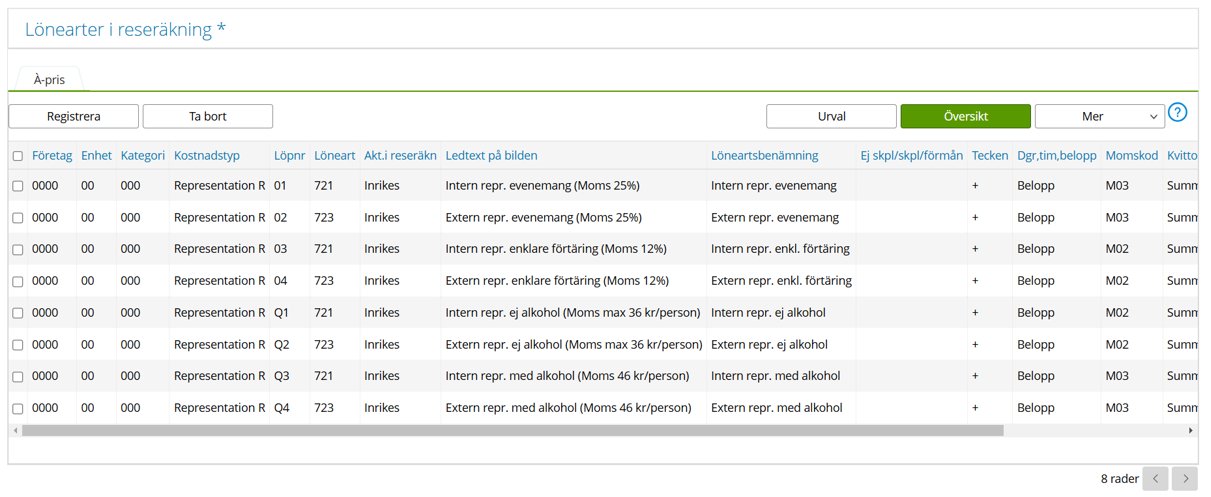 På nedanstående bilder finns exempel på hur du kan lägga upp nya rader i Reseförvaltningen, Lönearter i reseräkning och À-pris i reseräkning. Du kan då få olika rader att välja på när du registrerar representation i reseräkningen. På så sätt får du rätt momsavdrag för varje representation.