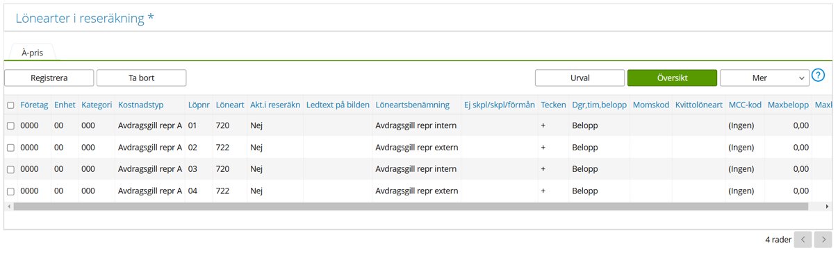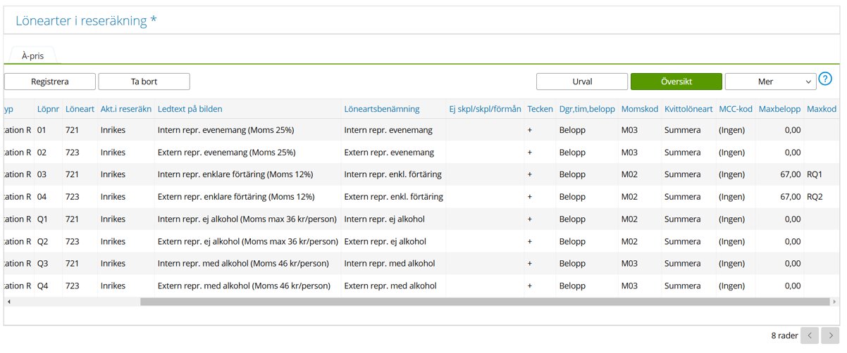 Motsvarande rader för avdragsgillt måste läggas in i lönearter i reseräkning samt a-pris i reseräkning. För att hämta maxbeloppet för moms (f.n. 14 kr.) lägger man upp en rad i a-pris i reseräkning med kostnadstyp Q och löpnummer 01. Övriga representationsrader (med löpnummer utan Q) hanteras på samma sätt som tidigare.