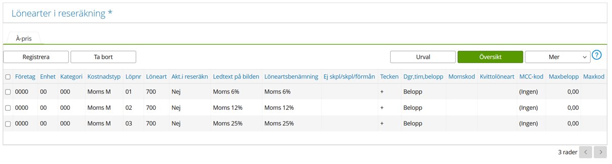 Möjlighet finns att lägga upp 99 olika momssatser i reseförvaltningens löneartstabell, M, 01 - M, 99. Momskoderna läggs på aktuella lönearter i Reseförvaltning / Lönearter i reseräkning och %-satsen läggs i A-pris - inrikes reseräkning.